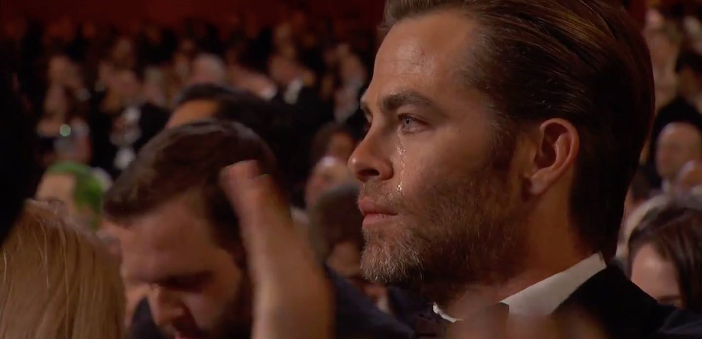 Chris Pine cries for no man! Except a single tear for Leonard Nimoy! (Okay, he’s crying at the Oscars…)